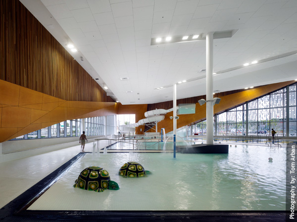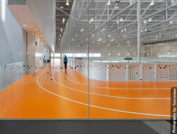 Hardwood courts for basketball, volleyball, and badminton.