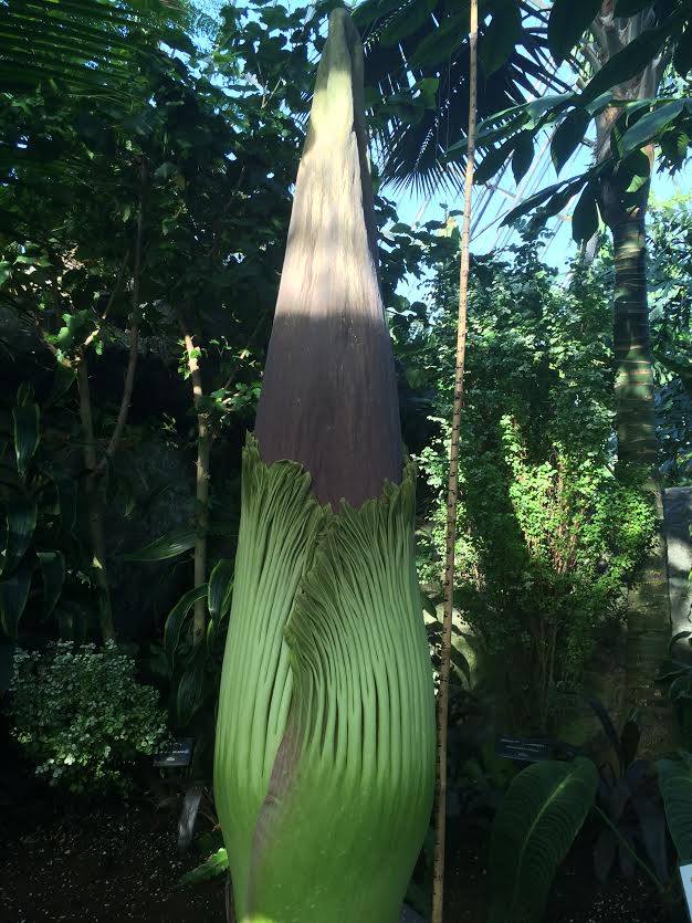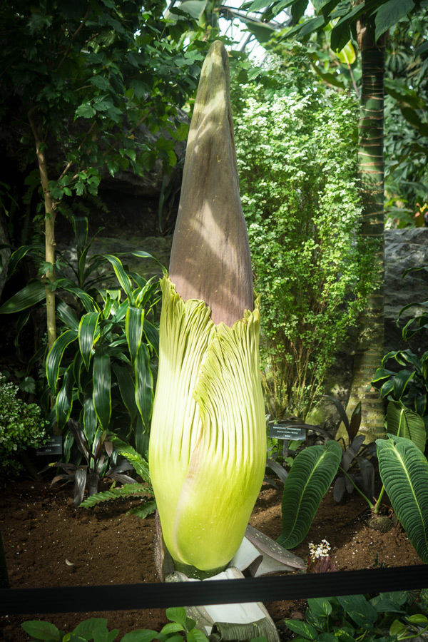 Putrella (Pew-trella) is a "Giant Corpse Flower" or "Titum Arum", nature's tallest flowering plant. When in bloom, the extraordinary flower is able to reach heights of over 10 feet. It's also the world's stinkiest flower, emitting a putrid smell to attract pollinators such as carrion beetles.