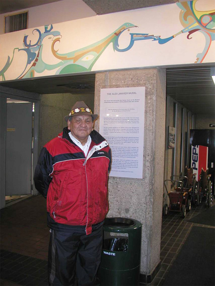 The mural that surrounds the Centre Court area of the Muttart Conservatory, completed in 1976, was painted by the well-known Alberta Chipewyan artist, Alex Janvier. Janvier completed his formal fine arts training at the Alberta College of Arts in Calgary in 1960. He first gained international recognition when he was commissioned to paint a nine foot mural for the Native Indian Pavilion at Expo ’67 in Montreal. Janvier’s works are at once a departure from the traditional and a return to Aboriginal culture. He paints in an abstract and highly symbolic style that shows the traditions of his culture.