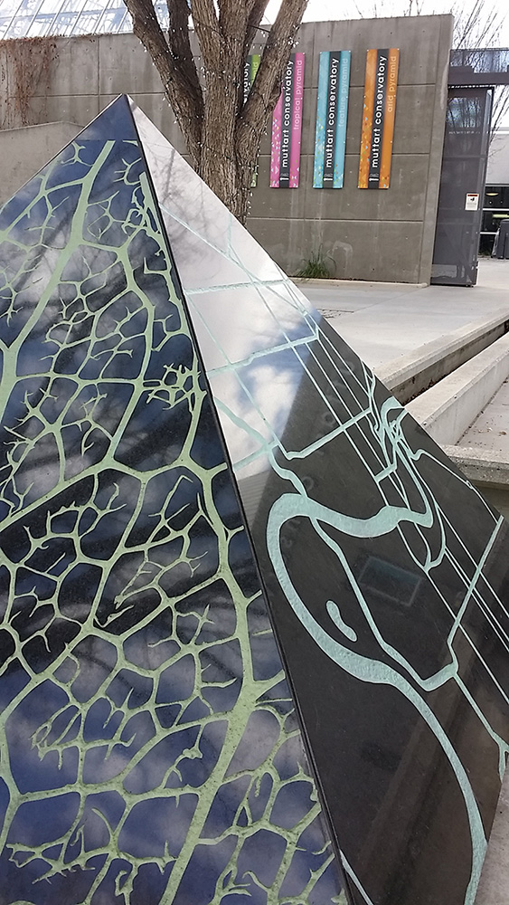 During facility renovations in 2008/2009, the front entry of Muttart Conservatory was updated and modified. Mia Weinberg was commissioned to create a black granite pyramid to mark the occasion. This piece can be found just outside of the main gates to the Conservatory and continues to draw guests to the beauty inside the glass pyramids.