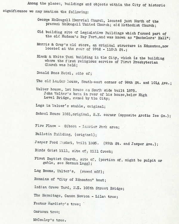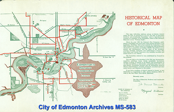 The sites identified by the committee were all pre-1900, with particular emphasis on resources associated with early prominent Edmontonians and early institutions, highlighting the public’s fascination with their pioneer-era forbearers after the Second World War.