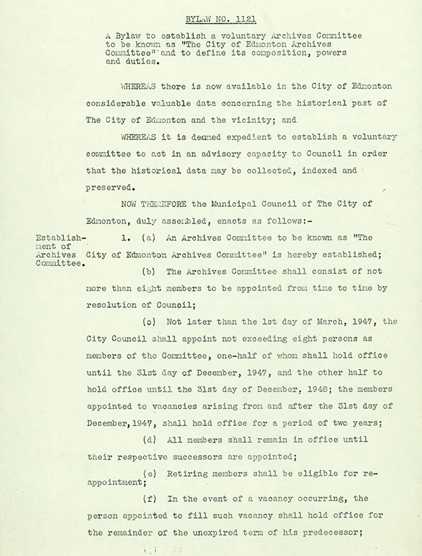 Page 1 of Bylaw 1121, establishing the Archives and Landmarks Committee 1947 -