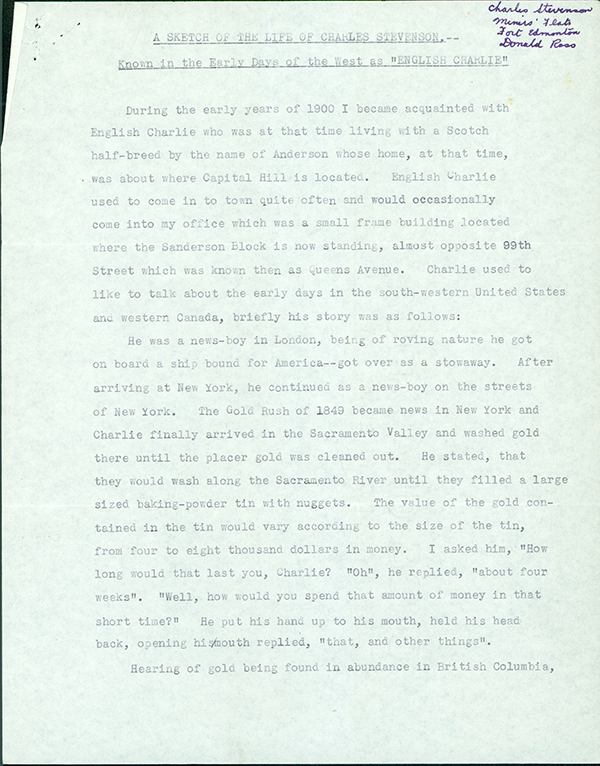 One of the earliest conservation projects undertaken by the Committee related to Charles "English Charlie" Stevenson, one of Edmonton's earliest and most colourful characters. English Charlie was said to be a London news-boy who came to the new world as a stow-away and travelled the continent panning for gold. He arrived in Edmonton in the 1870s, where he built a cabin in what is today Laurier Park, known in those days as Miner's Flats.