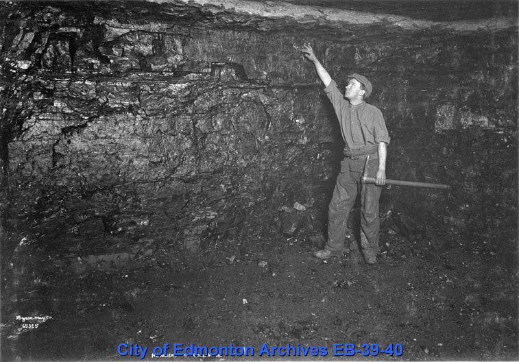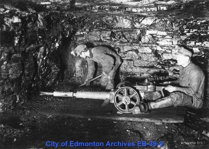 The mine originally used the room and pillar mining method, where miners would dig out coal using a pick and shovel, leaving “pillars” of coal in the centre of rooms to help hold up the ceiling. The tunnels were also shored up by timber men, using seven foot lengths of spruce, poplar and tamarack. The logs were cut by a crew near Entwistle and delivered to the mine.