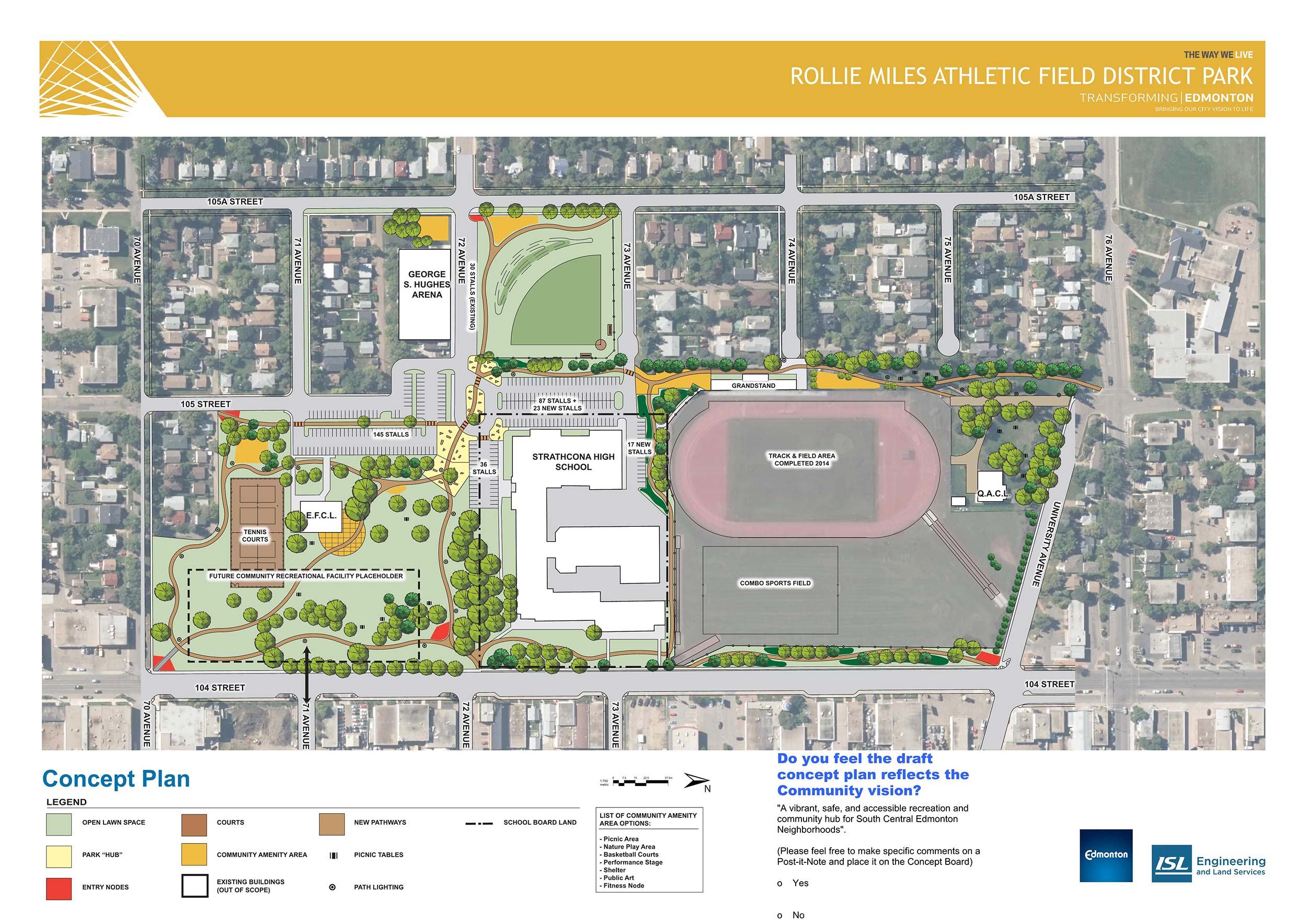 Located in a mature neighbourhood on the northeast corner of 104 Street and University Avenue, the Rollie Miles Athletic Field District Park faces the challenge of addressing community needs with infrastructure beyond its expected life cycle. The park is 13.09 hectares in the Queen Alexandra neighbourhood that supports many amenities including: Strathcona Composite High School, Queen Alexandra Community League, Edmonton Federation of Community League office, Strathcona pool, George S. Hughes arena, as well as tennis courts, a 400 metre synthetic running track and several sports fields.