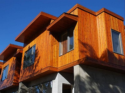 Cement-lime stucco and vertical cedar siding create a contemporary exterior that embraces traditional building materials and techniques. Organic, textured straw bale walls, exposed structural wood and concrete, as well as extensive window use, form the basis of a design that includes simple yet functional finishes and emphasizes locally-produced materials.