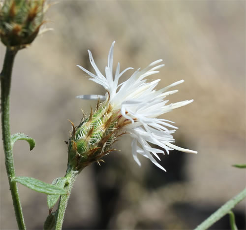 The flowers of diffuse knapweed are white to pink in colour and are surrounded by triangular bracts that narrow into short, stiff spines. Leaves are alternate, deeply lobed, and covered in fine hairs that give them a grey-green appearance.