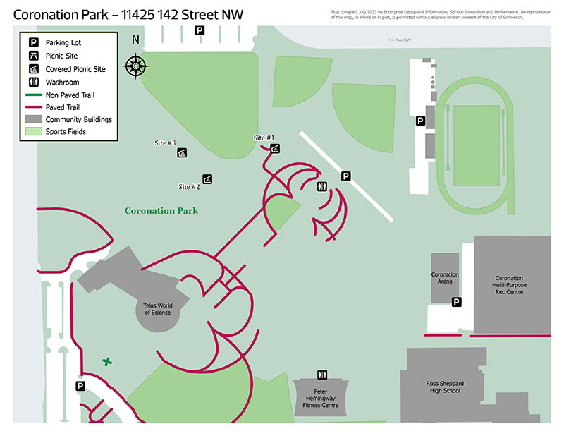 Coronation Park is within walking distance to a playground, Coronation Park Sports and Recreation Centre and the Telus World of Science. The picnic sites are covered with a canopy for shade, and there is a large grassy area for the public to use.
