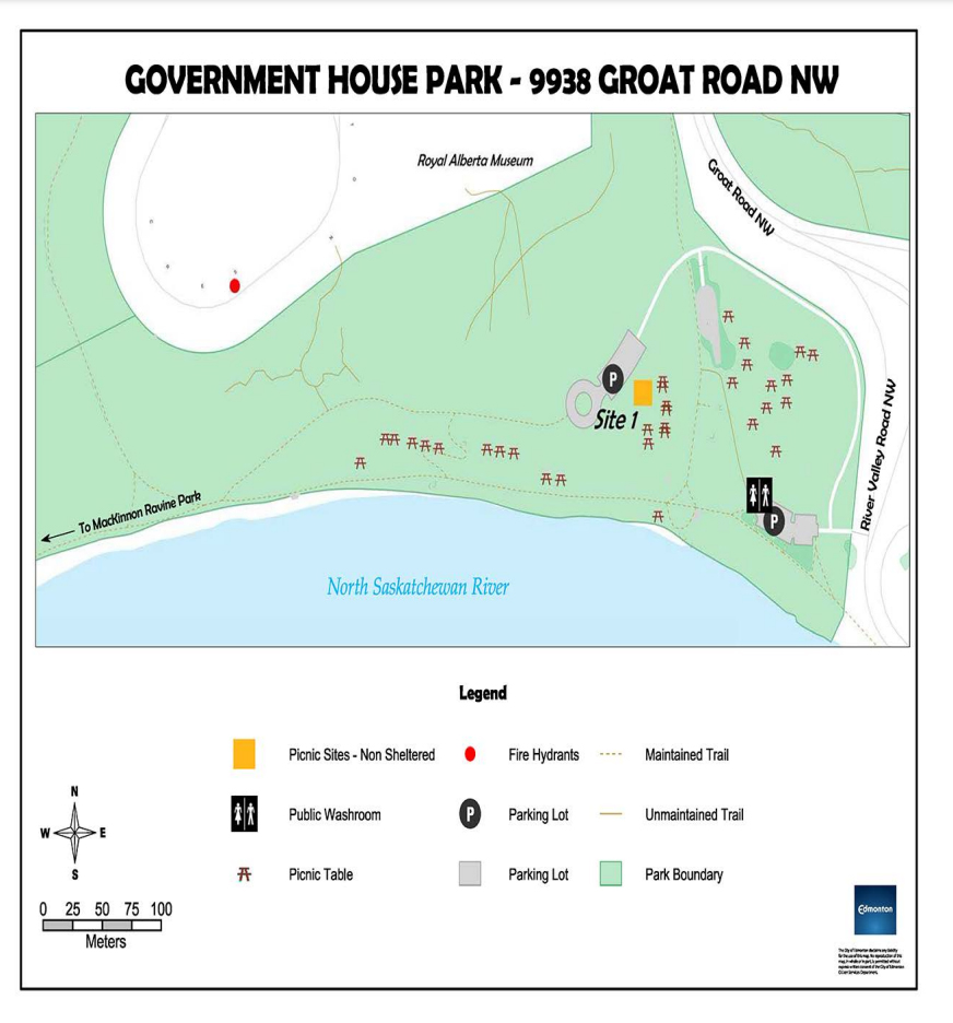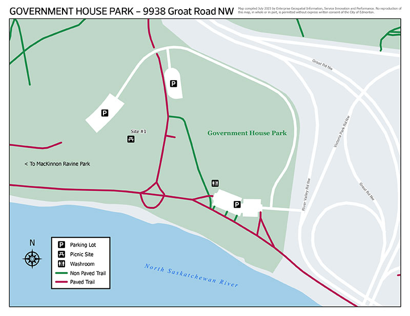 Government House Park is located on the north bank of the river, adjacent to Groat Road. Although no specific date is mentioned in the City Archives, it appears the park was in existence during the early 1960s and included a ski and toboggan hill. Along with the toboggan hill that still exists today, the park has many picnic sites and trails for users to enjoy.