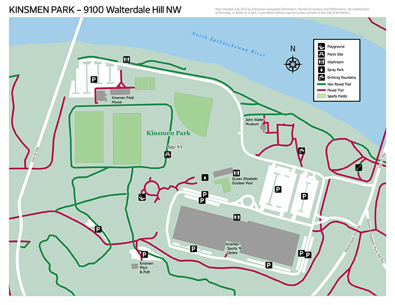 Kinsmen Park is located between the High Level Bridge and Walterdale Road on the south banks of the North Saskatchewan River. The park is adjacent to Queen Elizabeth Park to the east and Emily Murphy to the west, and is home to Kinsmen Sports Centre and Queen Elizabeth Outdoor Pool. The park is named after the Kinsmen Association of Canada, who helped raise money in the community to build the facility in the 1950s and 1960s.