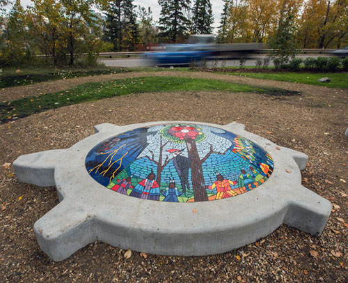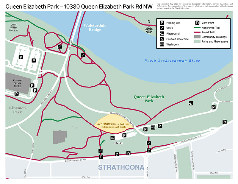Originally known as Riverside Park, Queen Elizabeth Park was renamed in 1939 by Edmonton City Council to honor the visit by King George VI and Queen Elizabeth. The park was home to Edmonton’s first swimming pool, the Southside Pool, built in 1922. Rising costs of maintenance on the aging pool and a crack in the pool basin led to its closure in 2004, and in 2011 a new pool opened just down the hill in Kinsmen Park. The park is now home to picnic areas, trails, a playground and ᐄᓃᐤ (ÎNÎW) River Lot 11∞.