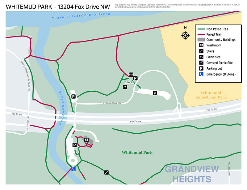 Whitemud Park is located just off Fox Drive between Fort Edmonton Park, the John Janzen Nature Centrekihcihkaw askî and Whitemud Equine Centre. Picnic sites, multi-use trails and a well-utilized toboggan hill in the winter are key amenities for this park. It is also home to the Alfred H. Savage Centre available for year-round bookings.