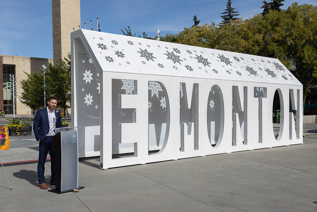 Visit the “Edmonton” sign! This innovative installation welcomes visitors to Edmonton, serves as a vibrant photo backdrop and brings life to the heart of the city. In winter, the sign lights up the Square, while in summer, it travels to festivals and City-owned facilities. The Edmonton sign was funded primarily from the Downtown Vibrancy Fund with additional funding support provided through Prairies Economic Development Canada.