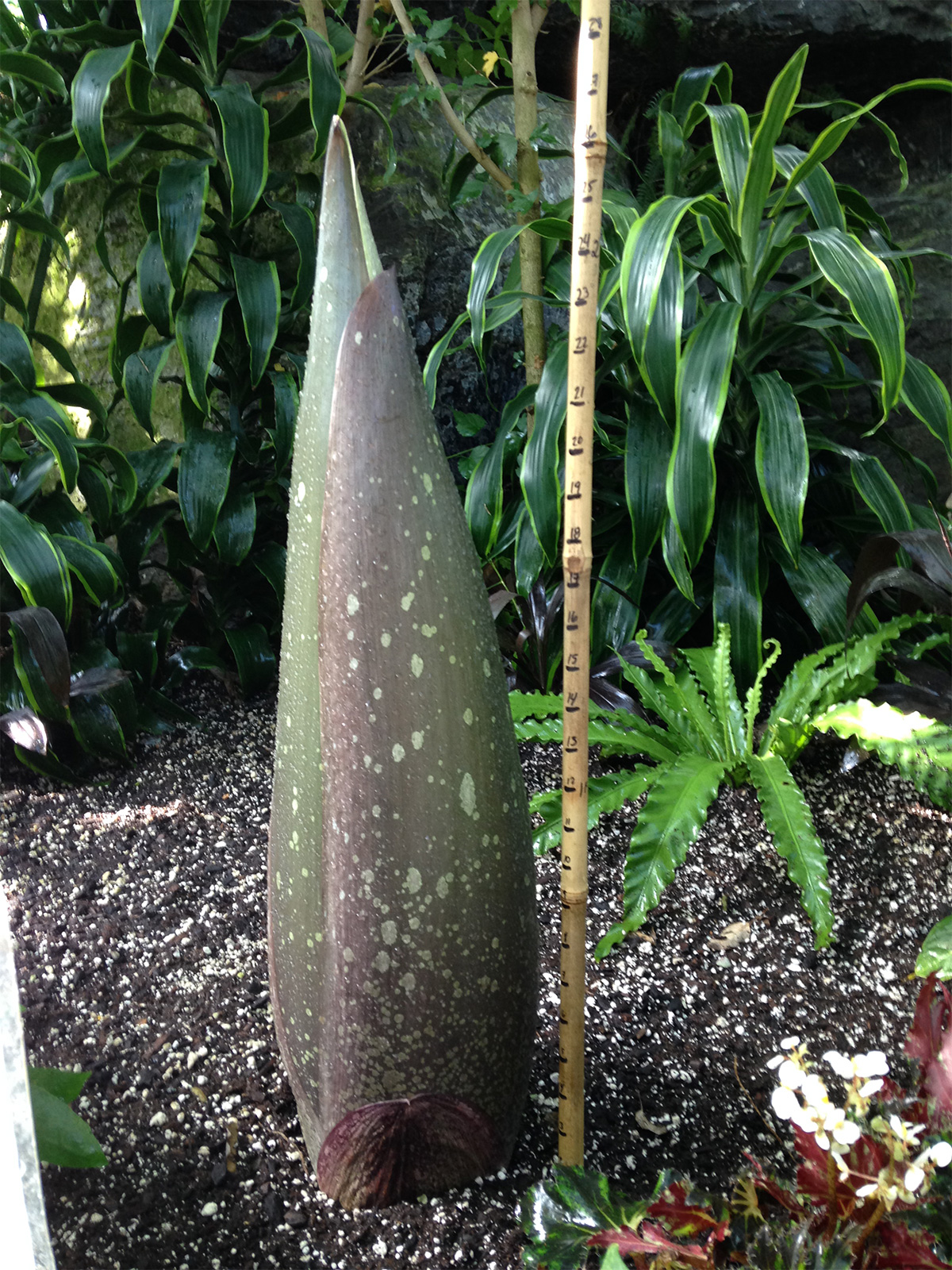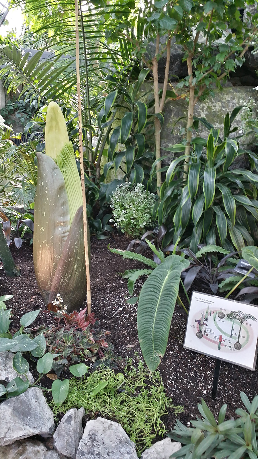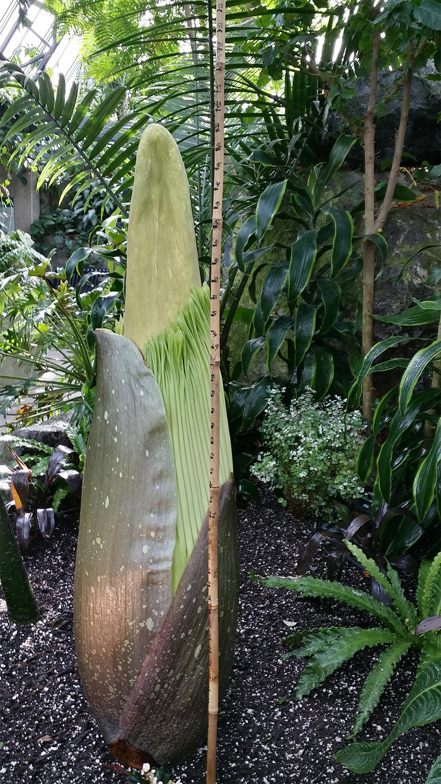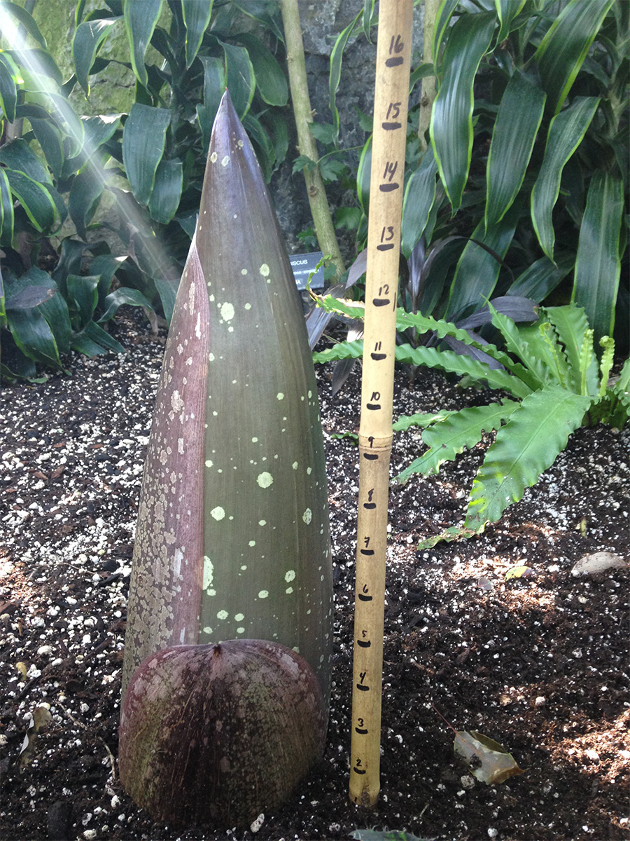 Putrella (Pew-trella) is a "Giant Corpse Flower" or "Titum Arum", nature's tallest flowering plant. When in bloom, the extraordinary flower is able to reach heights of over 10 feet. It's also the world's stinkiest flower, emitting a putrid smell to attract pollinators such as carrion beetles.