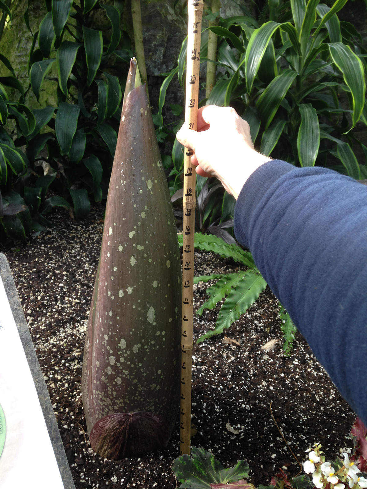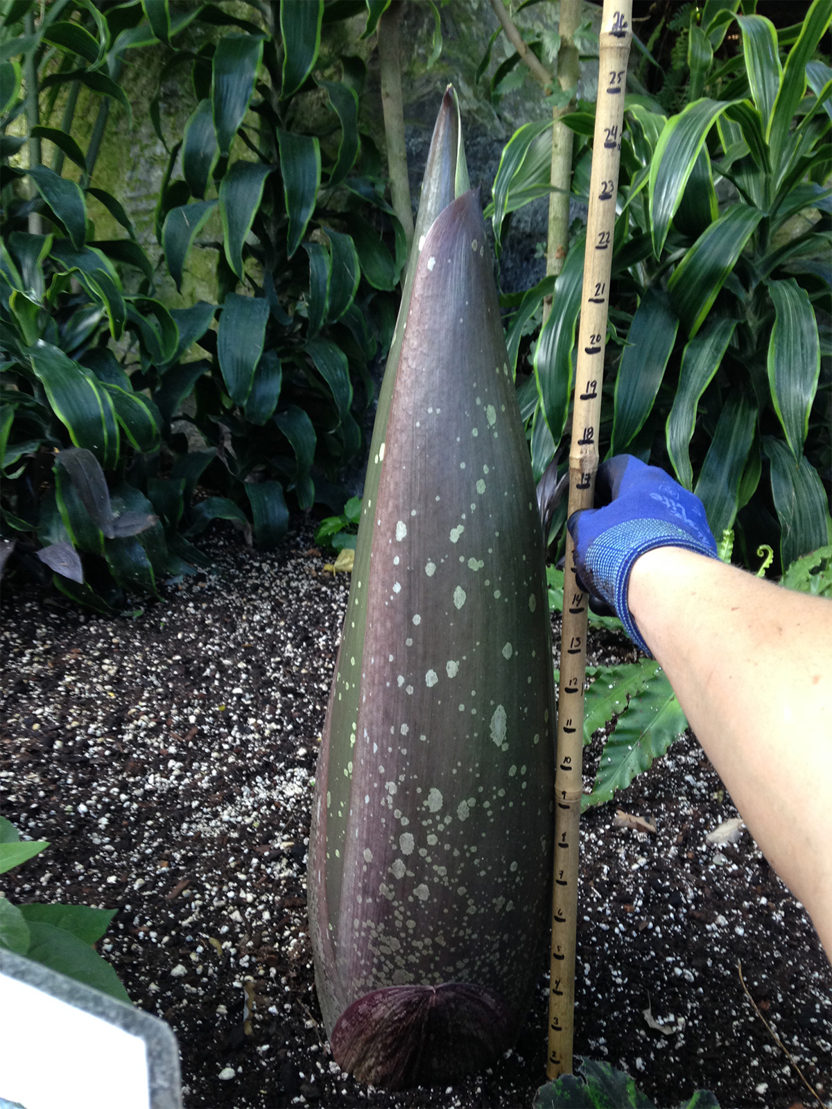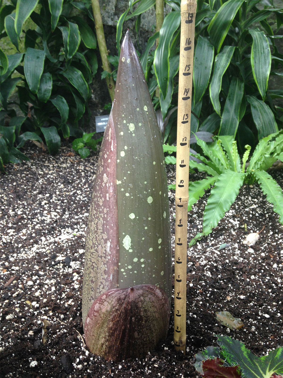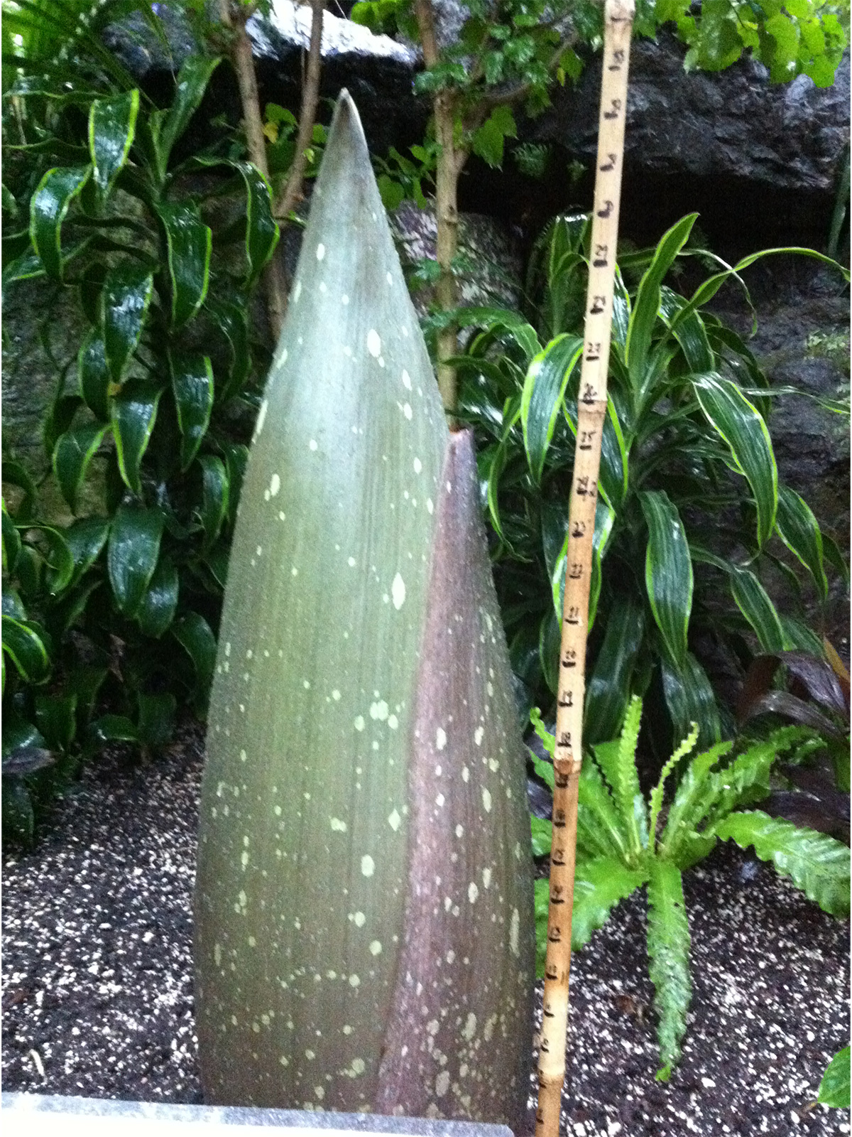 Putrella (Pew-trella) is a "Giant Corpse Flower" or "Titum Arum", nature's tallest flowering plant. When in bloom, the extraordinary flower is able to reach heights of over 10 feet. It's also the world's stinkiest flower, emitting a putrid smell to attract pollinators such as carrion beetles.