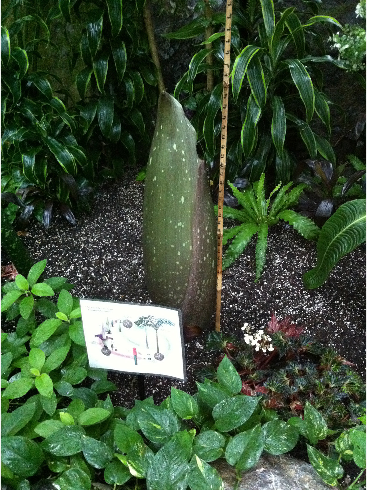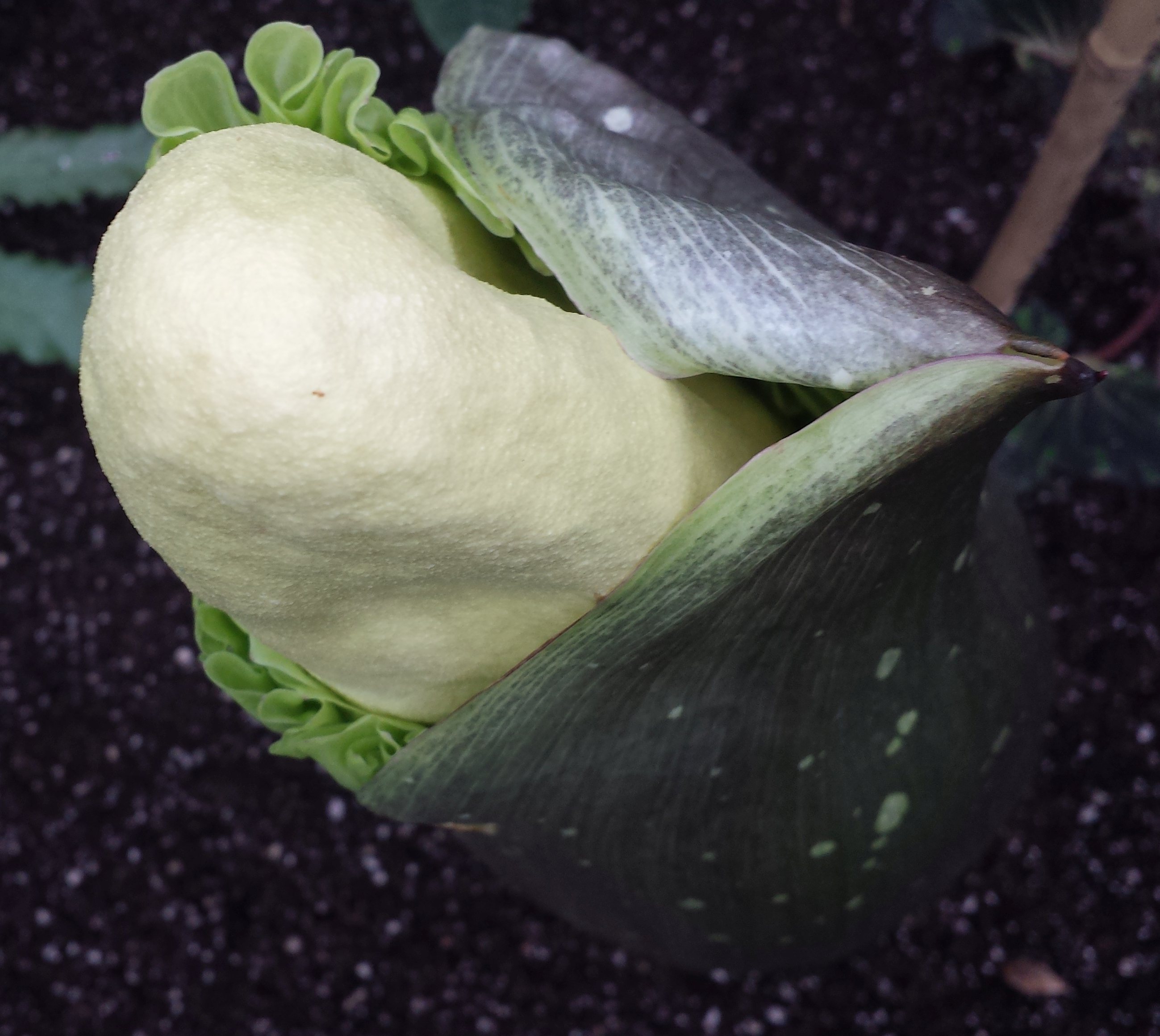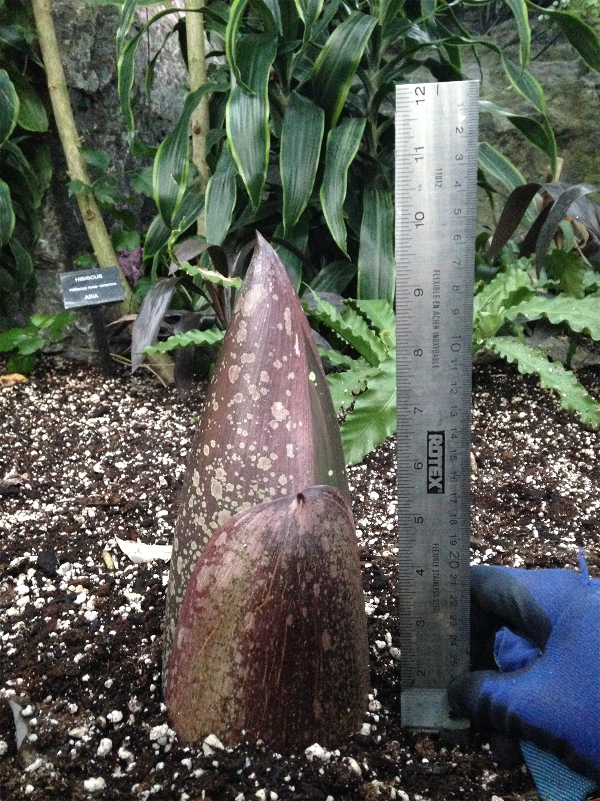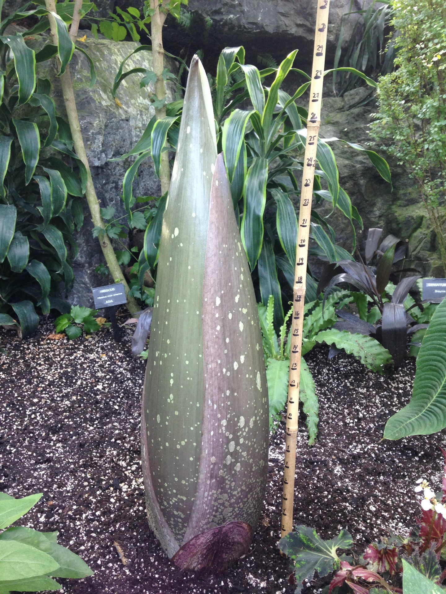 Putrella (Pew-trella) is a "Giant Corpse Flower" or "Titum Arum", nature's tallest flowering plant. When in bloom, the extraordinary flower is able to reach heights of over 10 feet. It's also the world's stinkiest flower, emitting a putrid smell to attract pollinators such as carrion beetles.