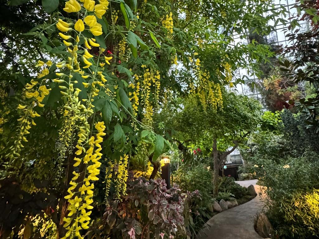 In spring, the pyramid comes alive! Magnolias start blooming in late February and pink redbuds add colour to bare tree branches. In April, you'll see bell-shaped rhododendron flowers and the Golden Chain Tree's cascading yellow blooms. When autumn comes around, the temperature and light decrease, and the leaves change colour, creating a beautiful fall display.