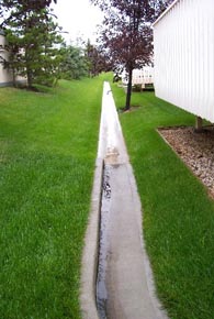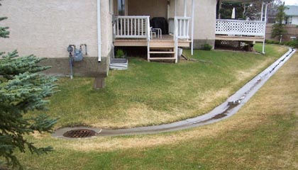 Drainage swales are shallow-sided, sloped channels intended for the conveyance of surface runoff. They are located between or around buildings and are graded to intercept and convey surface runoff to the nearest on-site catch basin, preventing lot-to-lot drainage.