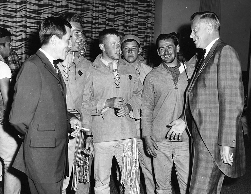 The Centennial Voyageurs Canoe Pageant saw 90 paddlers from across Canada travel from Rocky Mountain House to Montreal. In this photo, Alberta’s team share a laugh with Mayor Dantzer. [EA-408-18]