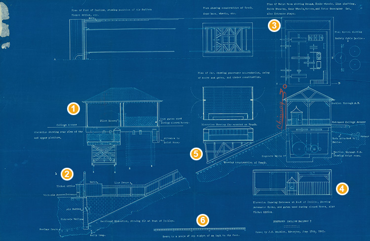 These blueprints were submitted to the City in 1907 as part of the documentation to get the railway running. Notice the many safety features listed in the specifications. [RG-8 Joseph Hostyn, Contract #12]