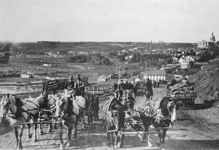 At that time, moving products from Strathcona and the river valley to Edmonton meant a trip over the North Saskatchewan River either by John Walter’s ferry or the Low Level Bridge, followed by a long march up McDougall Hill Road, which was especially treacherous when slippery and muddy due to rain and snow.