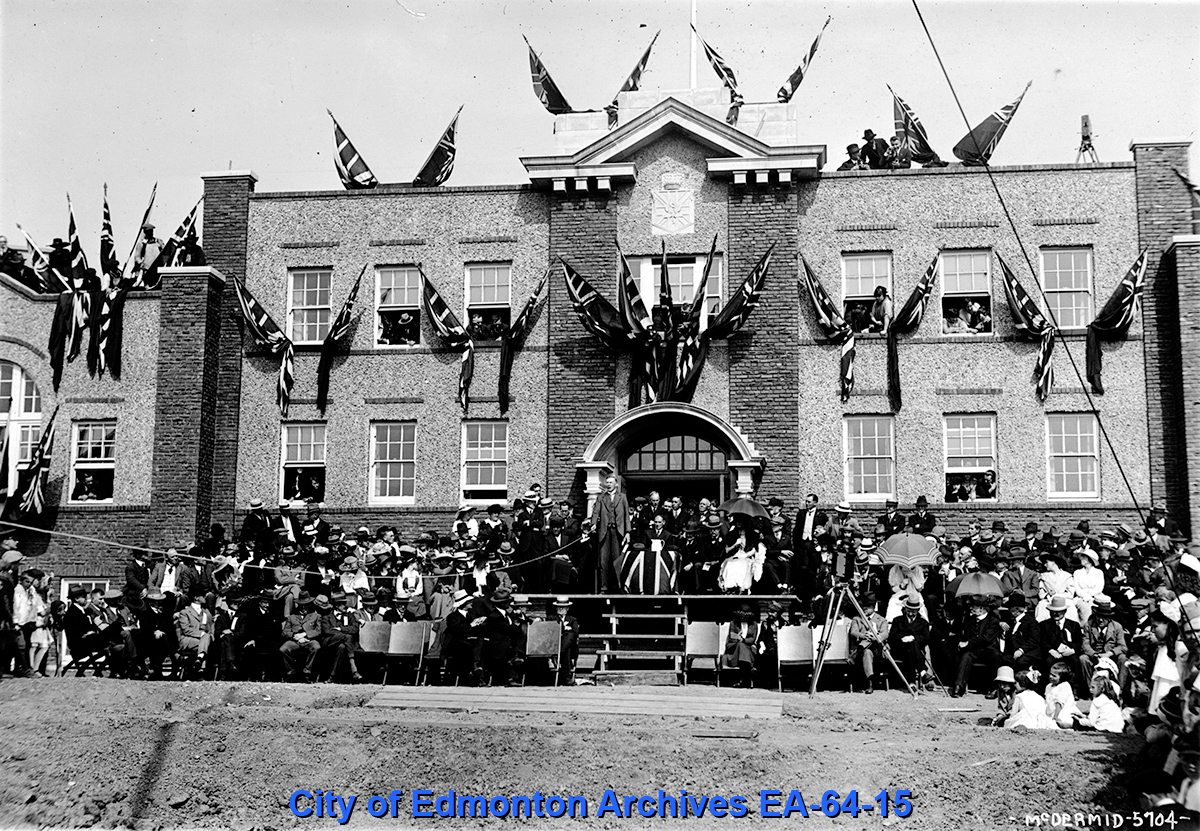 One major undertaking to honour soldiers began before the war had even ended. In August of 1918 the construction of a building to honour fallen soldiers was endorsed at a public meeting. When the structure was completed in 1920, it housed an assembly hall capable of accommodating 700 people, as well as offices, conference rooms, cloak rooms, and a dormitory for use by recently returned soldiers. Memorial Hall was given to the Great War Veterans’ Association as their official headquarters by the grateful citizens of Edmonton. Located on Macdonald Drive on the current site of the Telus Building at 10020 – 100 Street, 95% of the labour used in its construction was supplied by veterans.