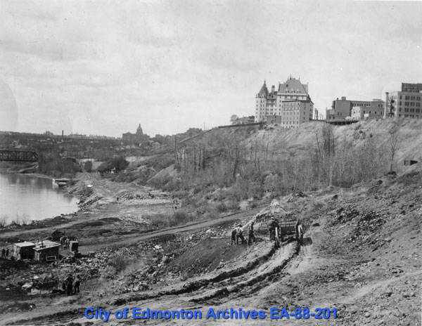 The Grierson Dump was located on the north bank of the river valley east of the Hotel Macdonald, roughly where the Shaw Conference Centre and Louise McKinney Park are today.