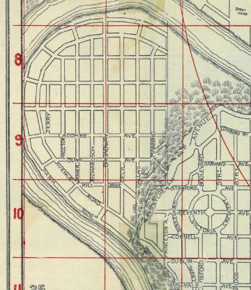 North of downtown and east of the Grand Trunk Pacific Railway (between 120 and 121 Street), avenues were named for rivers: St. Lawrence, Albany, Muskoka, Nipigon, Brazeau, Stikeen [sic], Okanagan [sic], Yukon, and Pembina. West of the railway the avenues were named for trees: Pine, Elm, Spruce, Willow, Oak, and Beech. Around the subdivision of Industrial Centre (now Delwood) the avenues were named for animals: Cariboo, Buffalo, Beaver, and Elk.