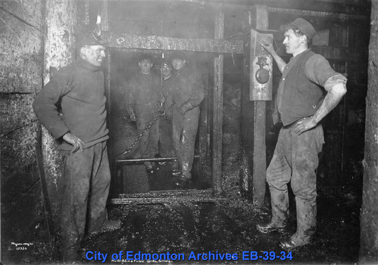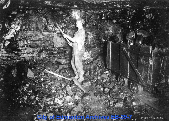 The mine originally used the room and pillar mining method, where miners would dig out coal using a pick and shovel, leaving “pillars” of coal in the centre of rooms to help hold up the ceiling. The tunnels were also shored up by timber men, using seven foot lengths of spruce, poplar and tamarack. The logs were cut by a crew near Entwistle and delivered to the mine.
