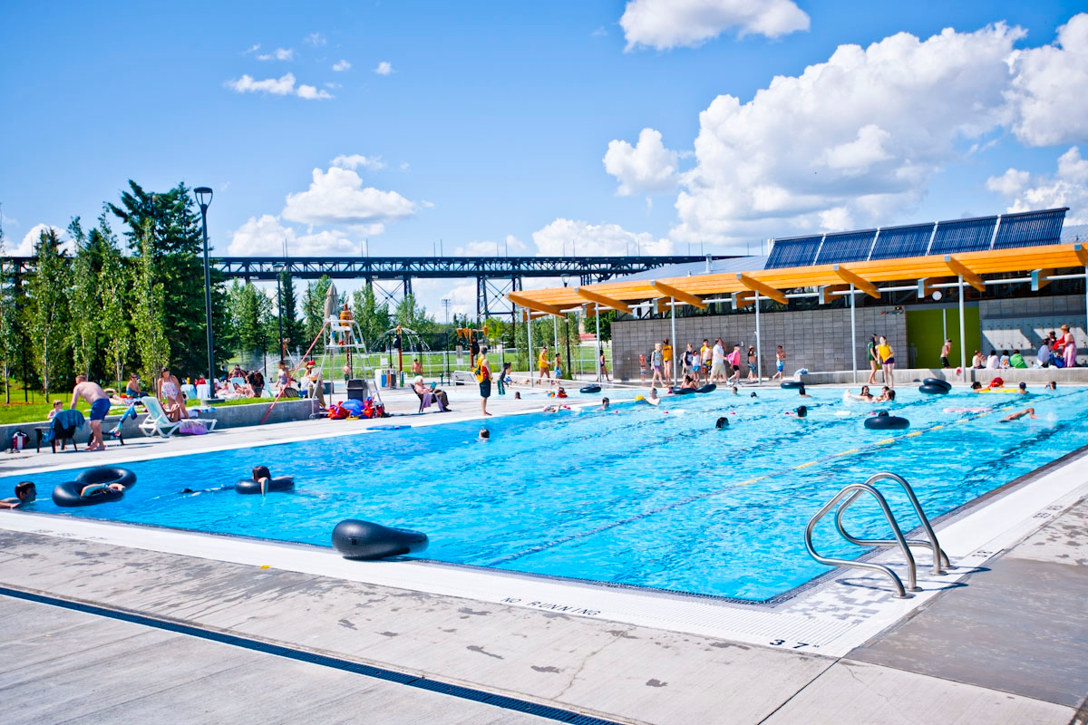 Queen Elizabeth Outdoor Pool was designed to be a modern green space that connects naturally to Edmonton's river valley. It incorporates many passive design elements, as well as solar systems that provide both energy and heat water.