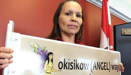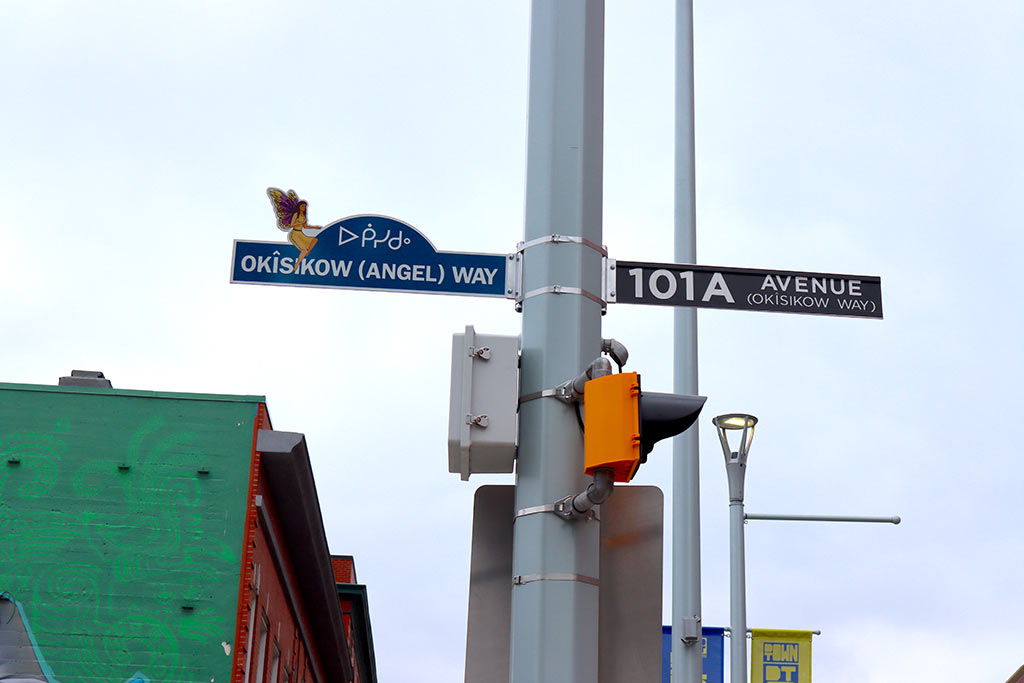 In March 2024, the City of Edmonton’s Naming Committee unanimously approved the name change of 101A Avenue, between 96 Street and 97 Street, from the honorary name “Okîsikow (Angel) Way” to “Okisikow Way NW”, an official street name and civic address. This name reminds Edmontonians that victims of violence and their families need safe spaces that provide shelter, support, and services.