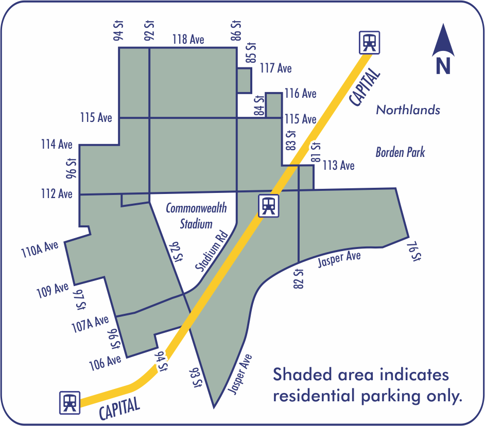 Please note: Parking is restricted around Commonwealth Stadium and the LRT Station. Signs are posted at these locations.