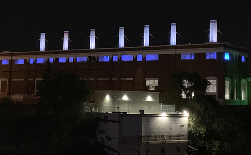 The Rossdale Power Plant is unique in Edmonton and one of the most important pieces of industrial heritage in Alberta. To highlight the architecture and history of the structure, the City invested in a permanent lighting display, illuminating the smokestacks and upper windows at night.