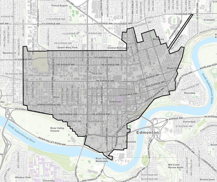 - The following neighbourhoods: Wîhkwêntôwin, Queen Mary Park, Central McDougall, McCauley, Boyle Street and Downtown.