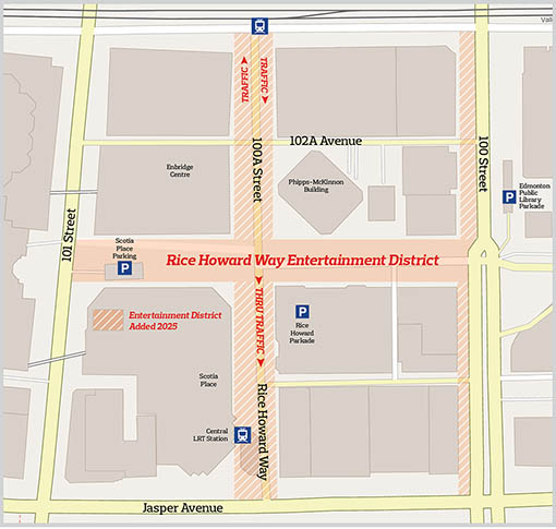 The area designated as the Rice Howard Way Entertainment District runs along 101A Ave between 100 Street and 100A Street as well as along 101A Street between 102 Avenue and Jasper Avenue.
