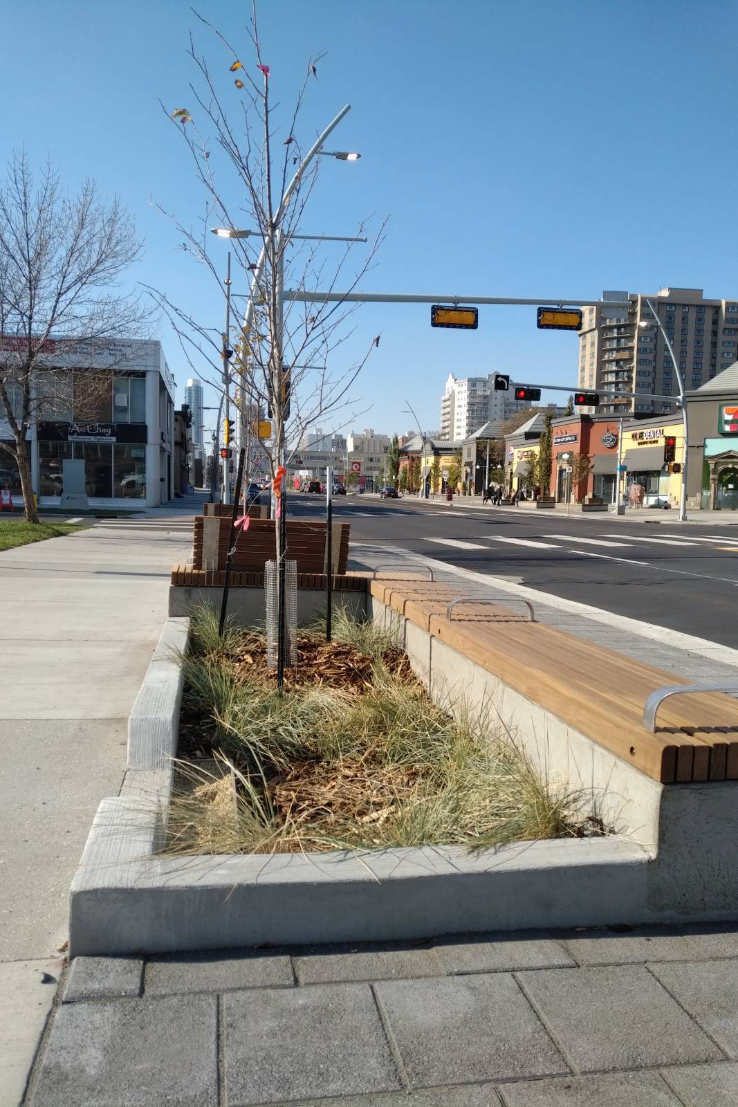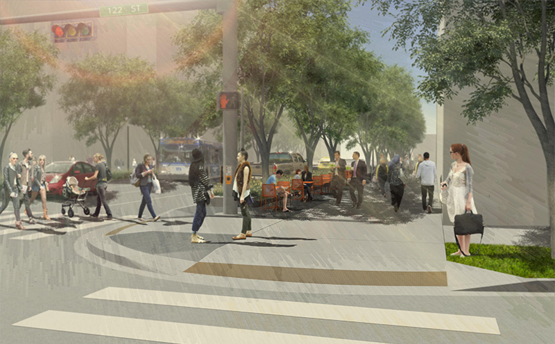 These upgrades align with the Imagine Jasper Avenue project goal of improving Jasper Avenue to be a safer, more accessible and comfortable corridor. The project includes two lanes of motor vehicle traffic in each direction, shorter pedestrian crossings, wider sidewalks and new landscaping and street furnishing.