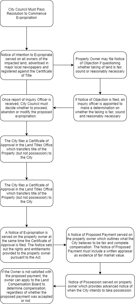 The process and timelines for notices, approvals, payments and possession dates are directed by the Act and can be time consuming and lengthy. Whenever possible, the City would rather reach a voluntary agreement to provide property owners ample time to make necessary arrangements without having to go through a formal legal process. This is always the preferred route over the expropriation process.