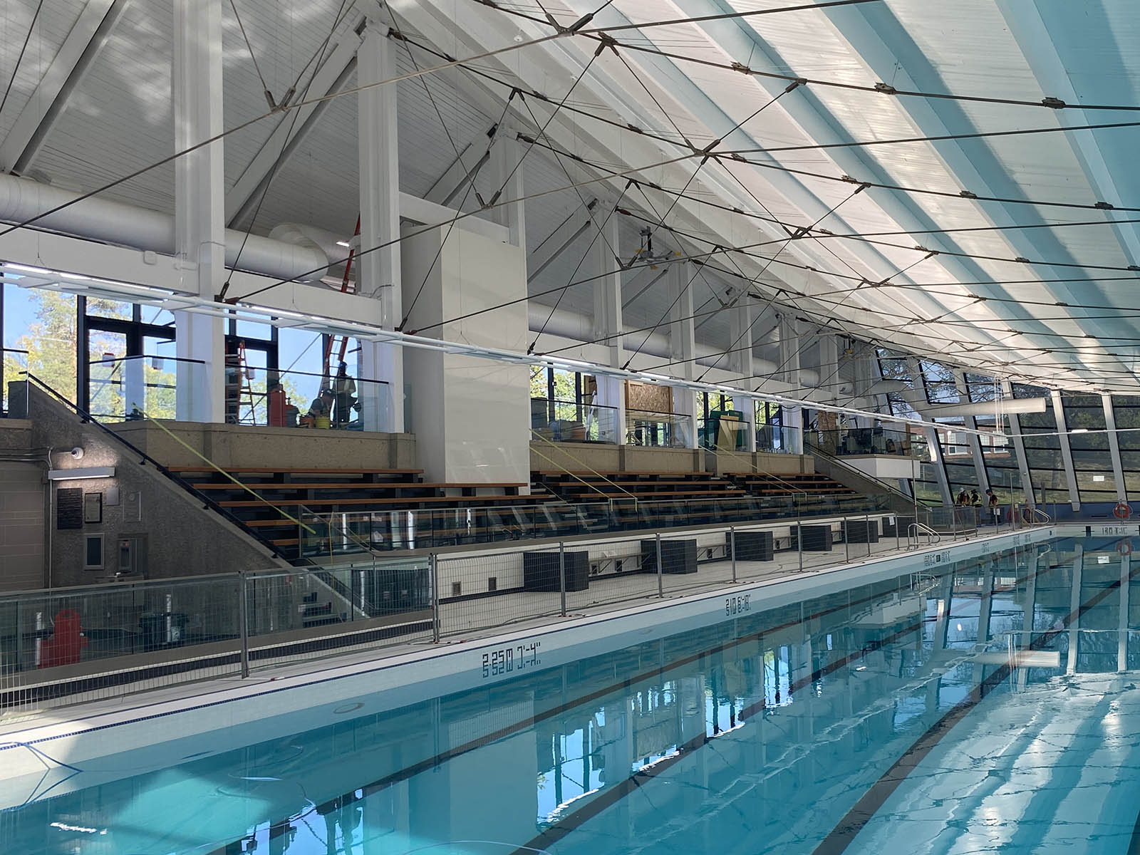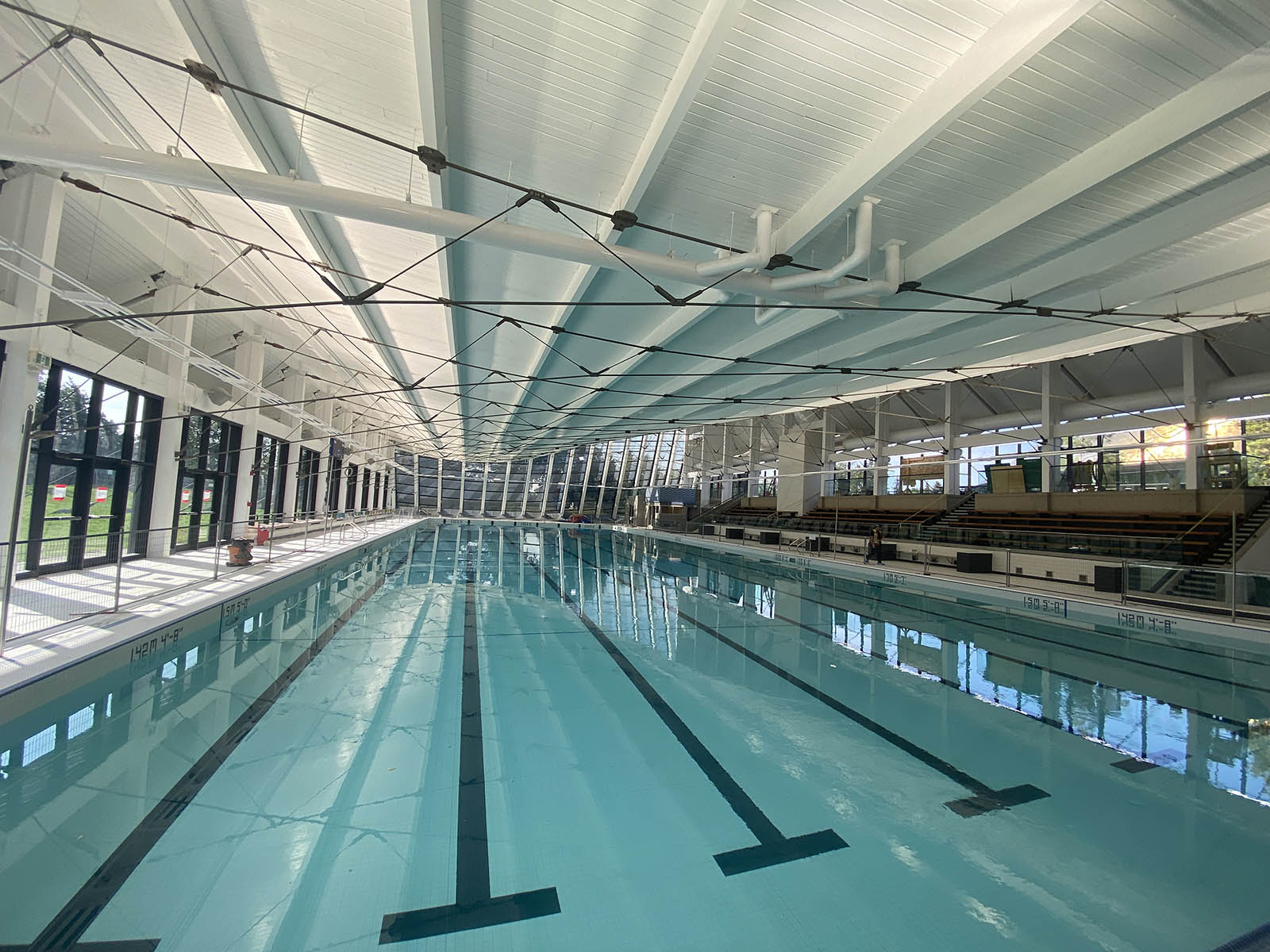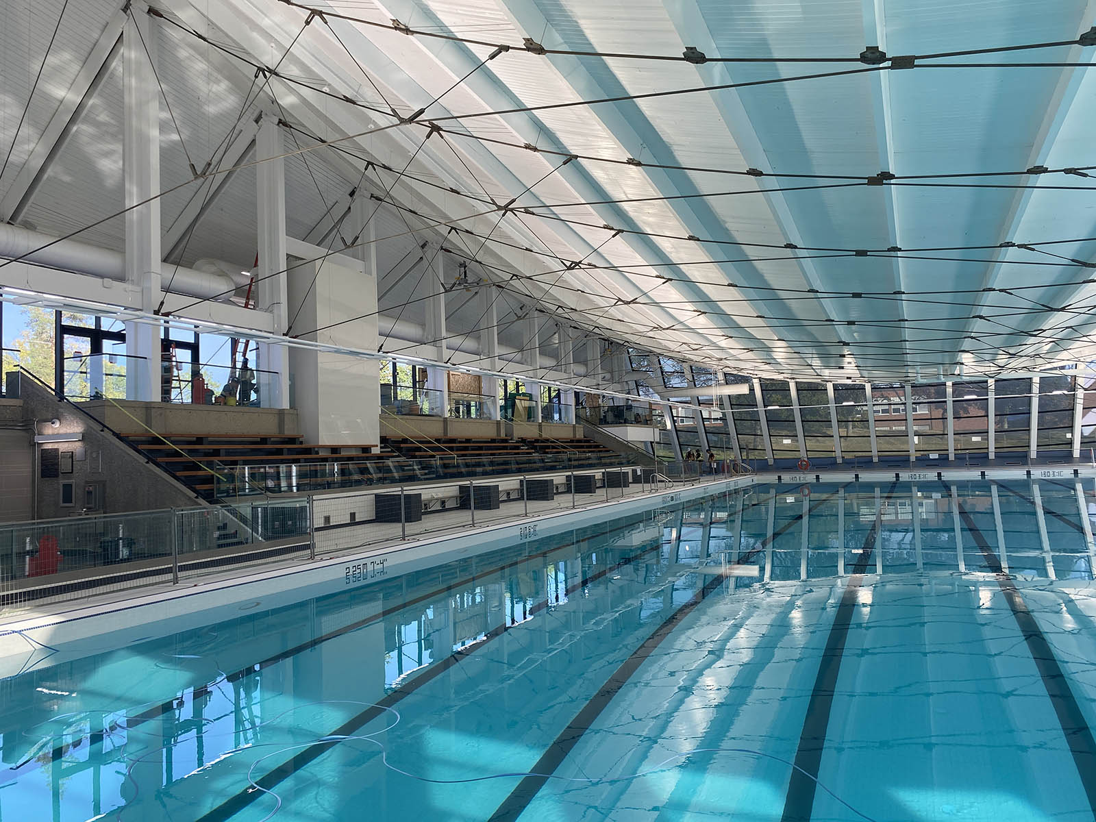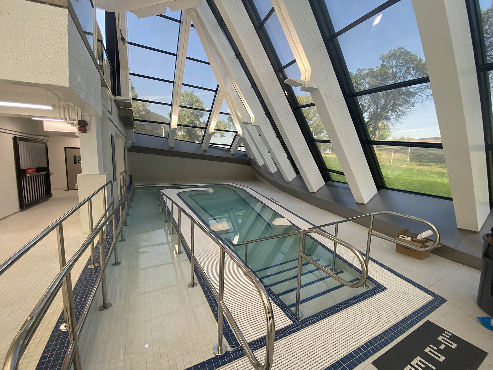Inside the facility, testing of the pool basin, as well as building mechanical and electrical systems, is underway and the swimming pool is being filled. Outside the facility, landscaping work is nearing completion.