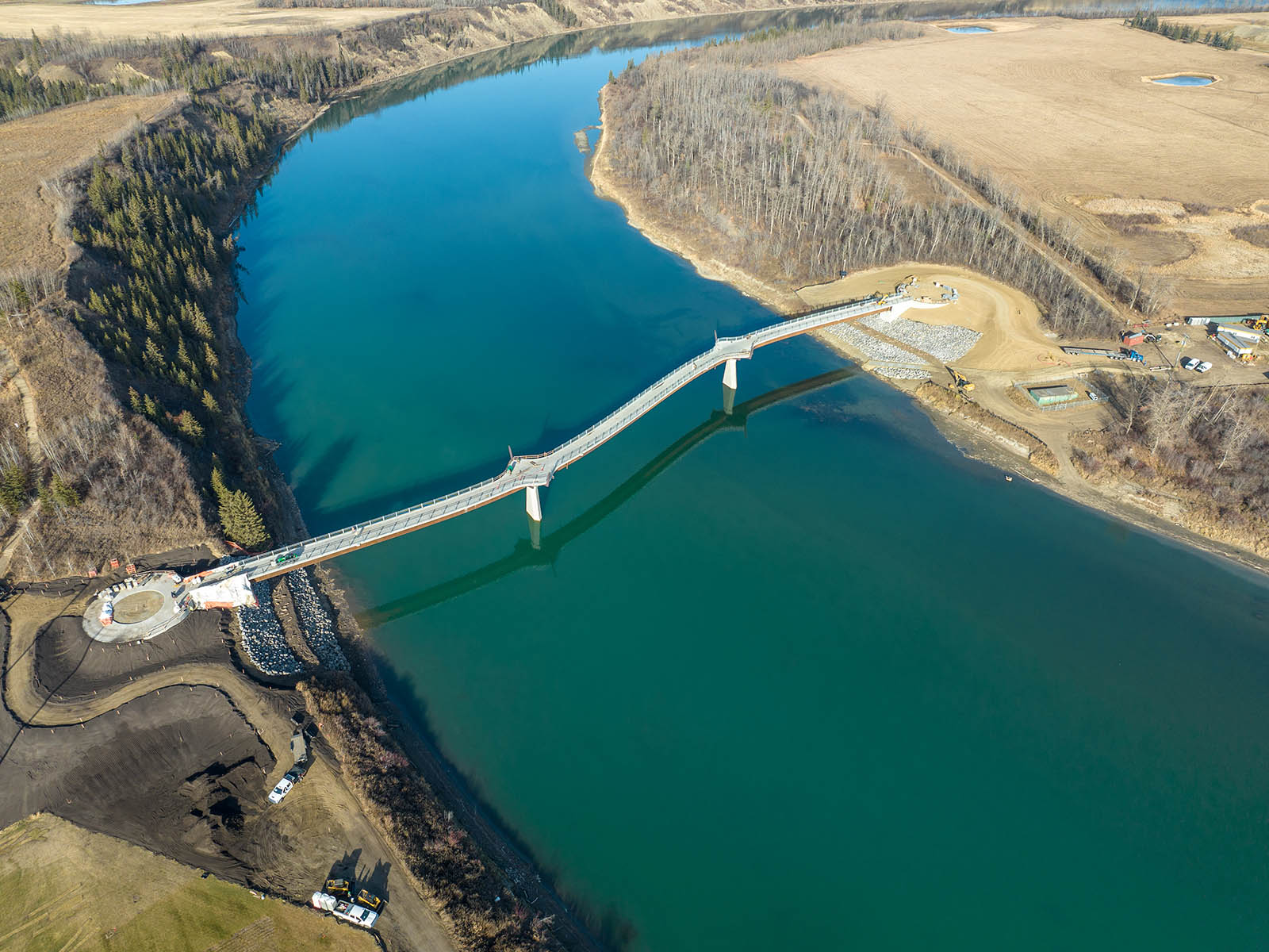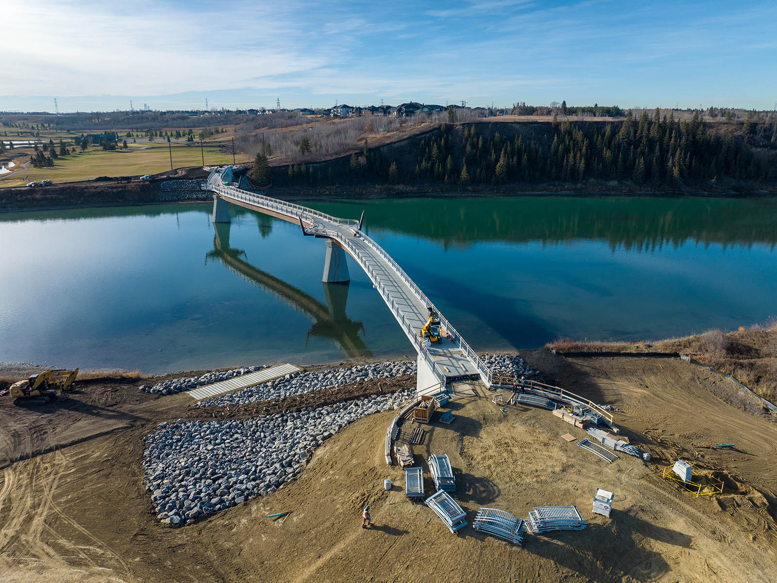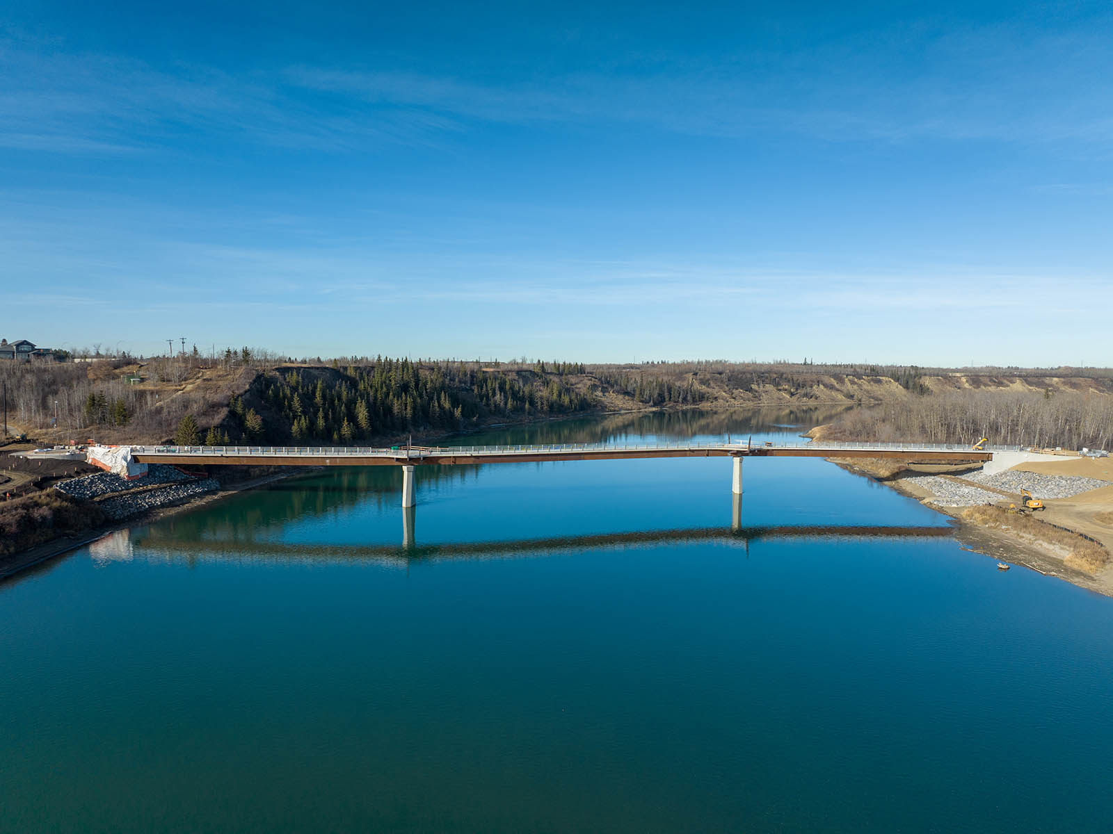 Completed in August 2025, the 230-meter span footbridge connects 167 Avenue in Edmonton to Township Road 540 in Strathcona County, improving access to the trail network of the North Saskatchewan River Valley and creating new opportunities for recreation and connection to green space. The bridge features a curved design that follows the natural landscape, with two lookout points for viewing the river valley, space for gathering and resting on either side of the bridge and is a shared pathway designed for people of all ages and abilities.