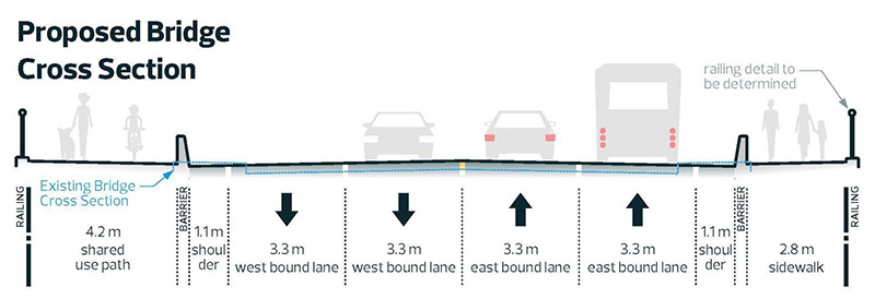 The current structure will be replaced with a clear-span girder bridge that incorporates some historical elements of the existing bridge. The new design improves accessibility and safety with wider traffic lanes, dedicated cyclist and pedestrian spaces, including a shared pathway, safer traffic barriers, handrails and new street lighting.