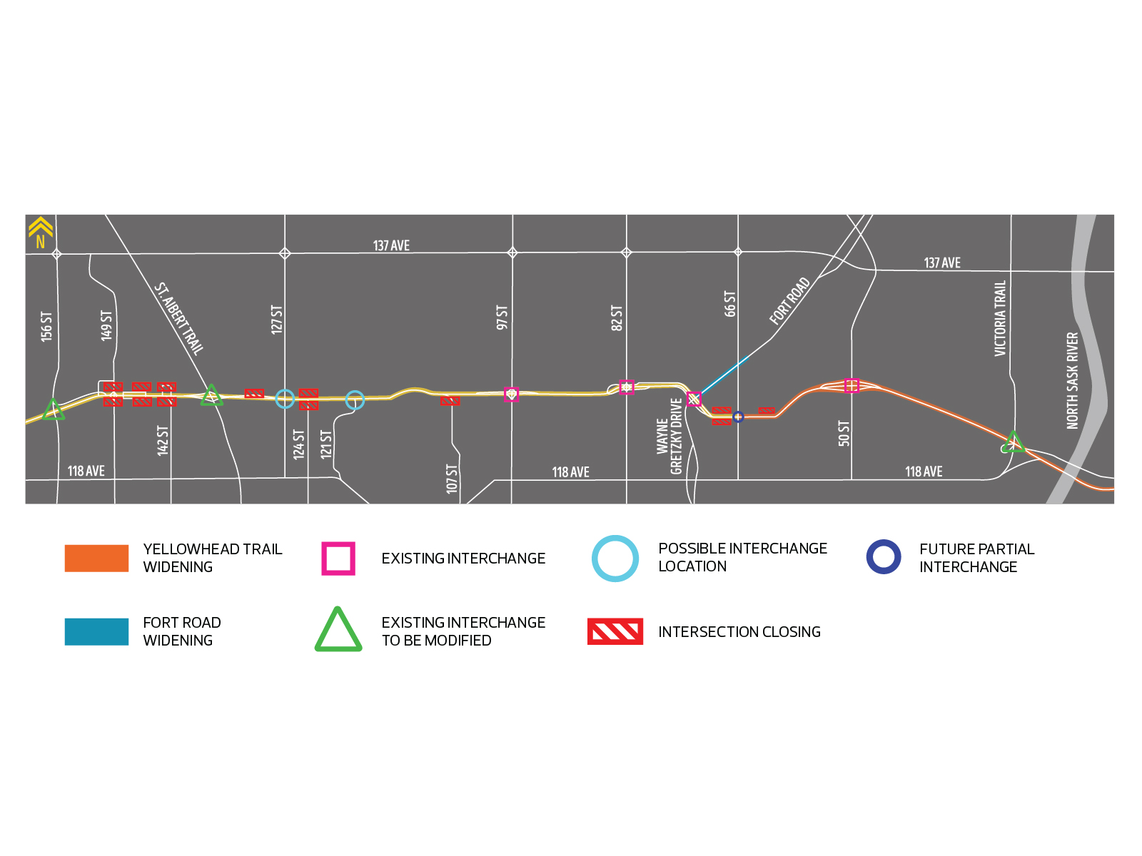 As part of the freeway conversion, options for new interchanges are being explored between St. Albert Trail and 97 Street, and construction of a new overpass has been recommended at 66 Street. New parallel roads between some interchanges will support access to areas that previously had direct access on or off Yellowhead Trail.