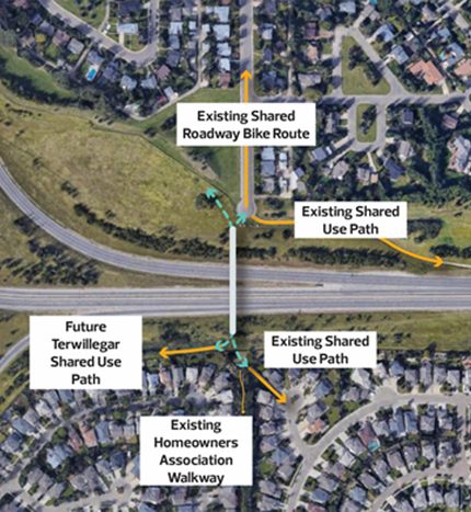 During public engagement, three active transportation connections were shared: two shared-use path options running along the east side of Brookside, connecting the bridge to 53 Avenue, and the continued use of the existing shared roadway bike route on 142 Street.