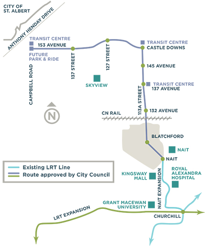 See the Metro Line Northwest LRT extension route alignment from NAIT to Campbell Road and example station designs.