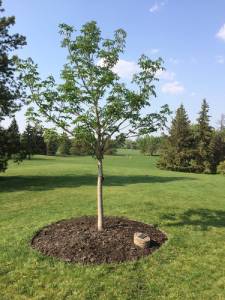 - Top with a 5-7cm deep mulch ring to help with moisture retention and to improve soil quality. This mulch will also help to protect the tree’s roots from extreme weather conditions, which are becoming more common in Edmonton. Keep the mulch at least 5cm away from the tree trunk to prevent moisture from building up against the trunk which can cause decay. Mulch should be reapplied as it breaks down as mature trees benefit from mulch too. Ensure that the mulch isn’t deeper than 10 cm as too much mulch may prevent oxygen from entering the soil, which roots need to survive.