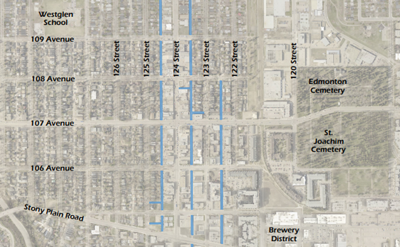 City Council has prioritized renewing alleys and front streets in Edmonton’s 13 Business Improvement Areas (BIAs). This renewal is separate from the neighbourhood they are located in. The 124 Street BIA Alley Renewal project may also slightly extend beyond the 124 Street and Area BIA boundary in order to fully complete a block or alley, which is necessary for design and construction.