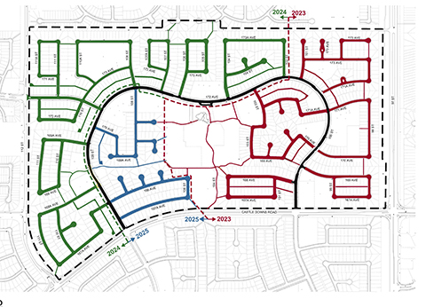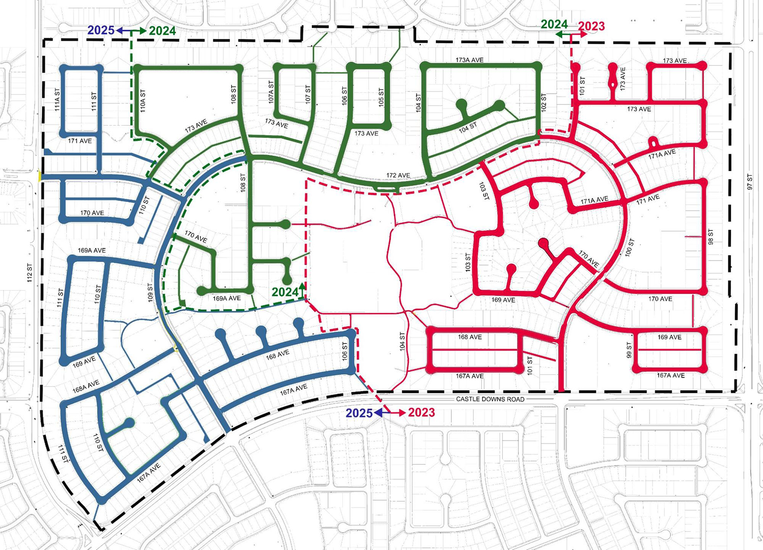) will now be done in 2025. The concrete work along the collector road, including sidewalks and curbs, will continue to follow the year split lines shown below in each year. We recognize that construction has an impact on the community. This decision was made to maintain access to Edmonton Transit Service bus routes that run along the collector road.
