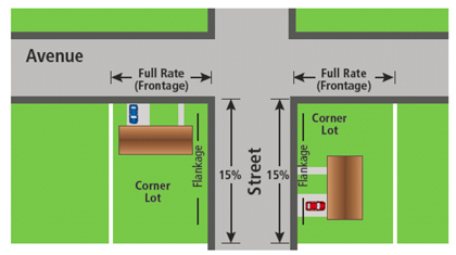 The cost is determined by adding the front and rear lot dimensions and dividing the total in half. The average is used for the purposes of assessment and may not be more than twice the front lot dimension. The rear dimension of a pie-shaped lot is scaled off the corner at the shortest side and is projected at a right angle to the longest side.